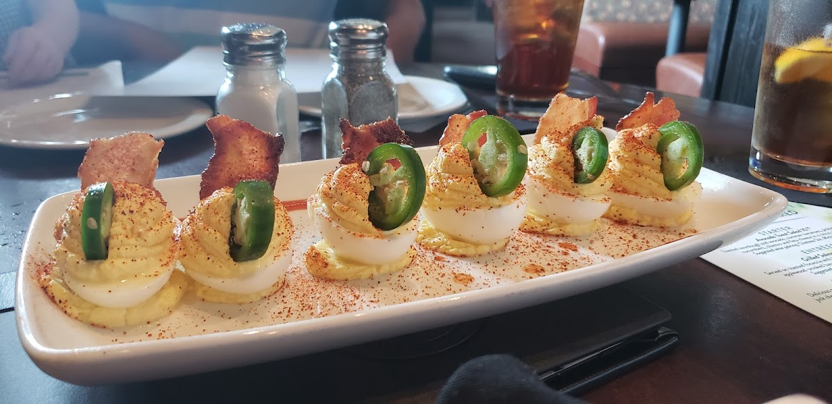 Dinner or lunch here is ALWAYS top-notch! Service is efficient and friendly. The decor has a bit of an upscale vibe and the smell of the woodsmoke coming from the open fire grilling is divine. You won't get a more tender, perfectly cooked steak! The sides, salads, and appetizers are all great. The garlic butter sirloin with charred carrots is our favorite. The deviled eggs with candied bacon are a MUST try as an app. YUM!! Their ribs are some serious fall off the bone deliciousness. They have a nice variety of salads, very fresh and filling. Their desserts are all very decadent, delicious and HUGE, enough to share between 2...or 3! The atmosphere is very comfortable and rather cozy. They have a full bar that is quite attractive and lots of nice, booth style, high-top seating. Good family place or date night place. Highly recommend!